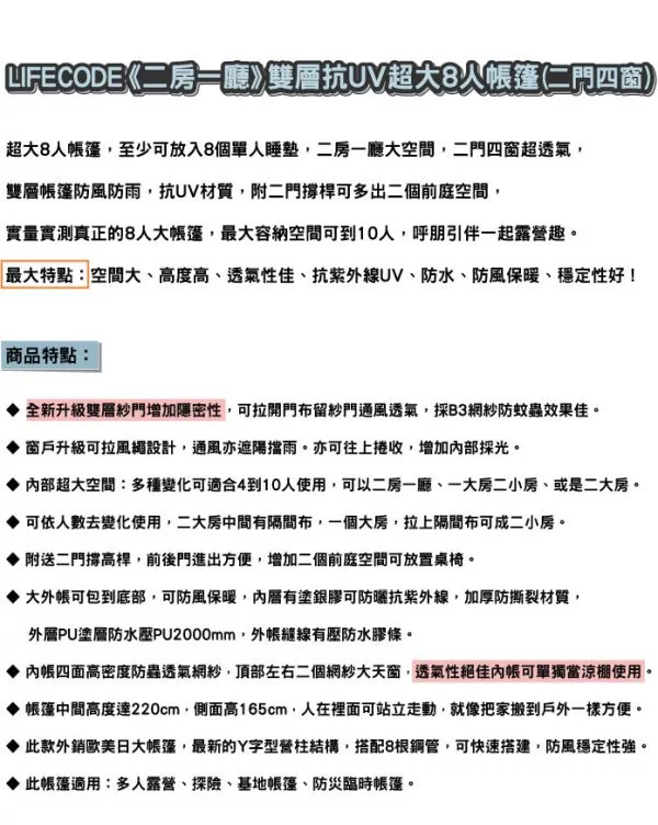 【LIFECODE】《二房一廳》抗紫外線超大8人帳篷(二門四窗)-咖啡色 評價